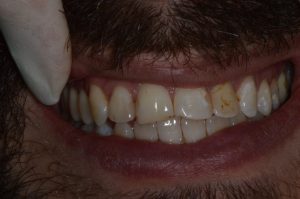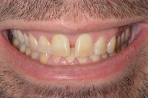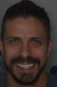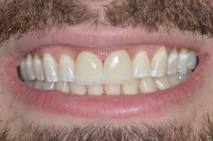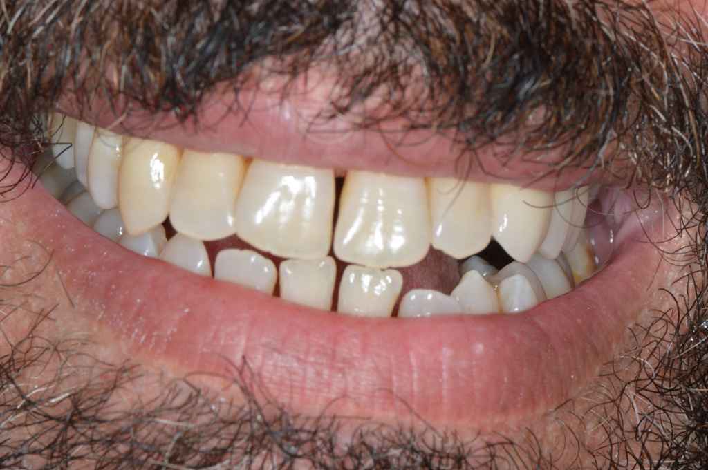 In realtà, i risultati migliori si ottengono spesso combinando le due cose. In questo caso, il paziente presentava una situazione di partenza complessa: un evidente disallineamento dell’arcata superiore e un colore dei denti insoddisfacente, ingiallito e macchiato dall’uso costante di caffè e sigarette.
